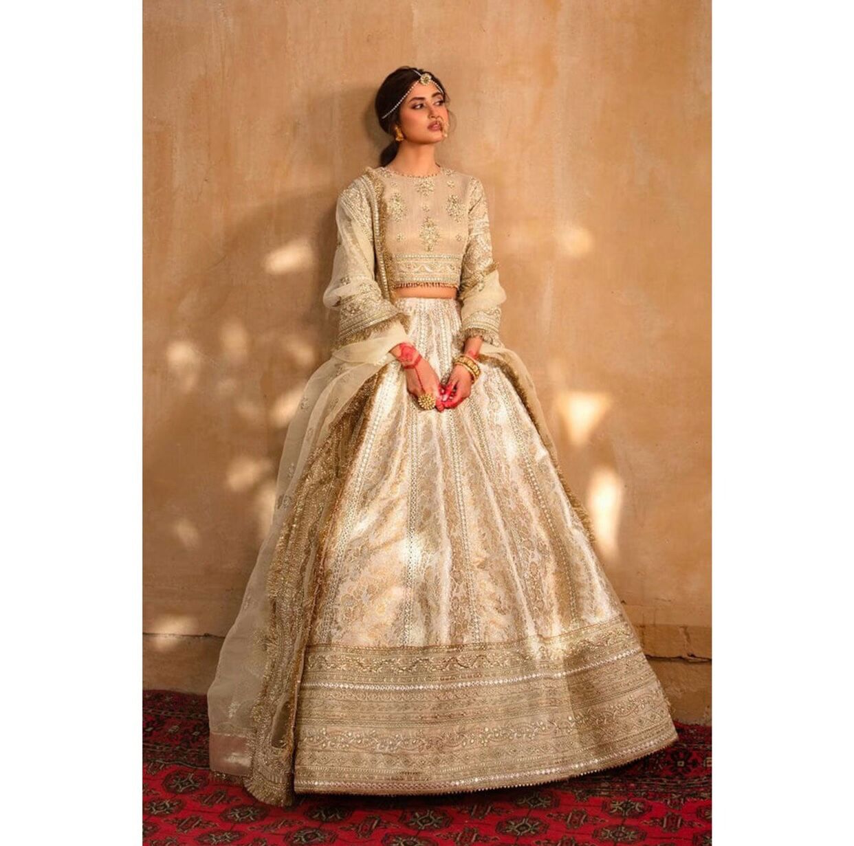 A breathtaking ensemble featuring a net bodice adorned with meticulously hand-embroidered detailing, radiating timeless elegance.