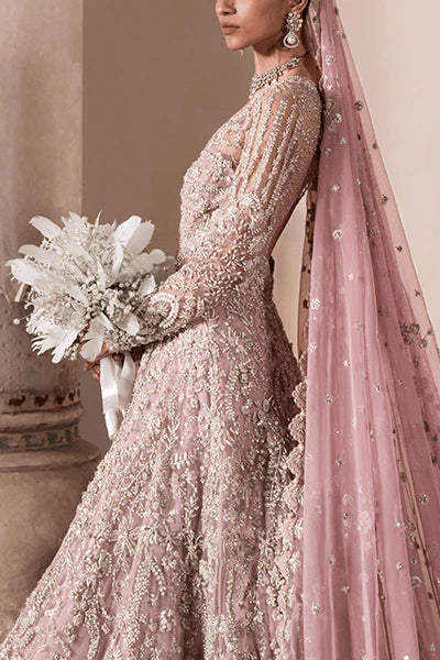 A breathtaking ensemble featuring a net bodice adorned with meticulously hand-embroidered detailing, radiating timeless elegance.