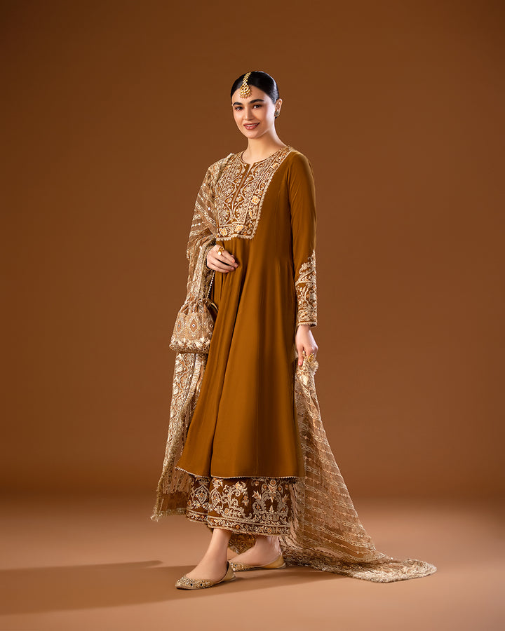 A breathtaking ensemble featuring a net bodice adorned with meticulously hand-embroidered detailing, radiating timeless elegance.