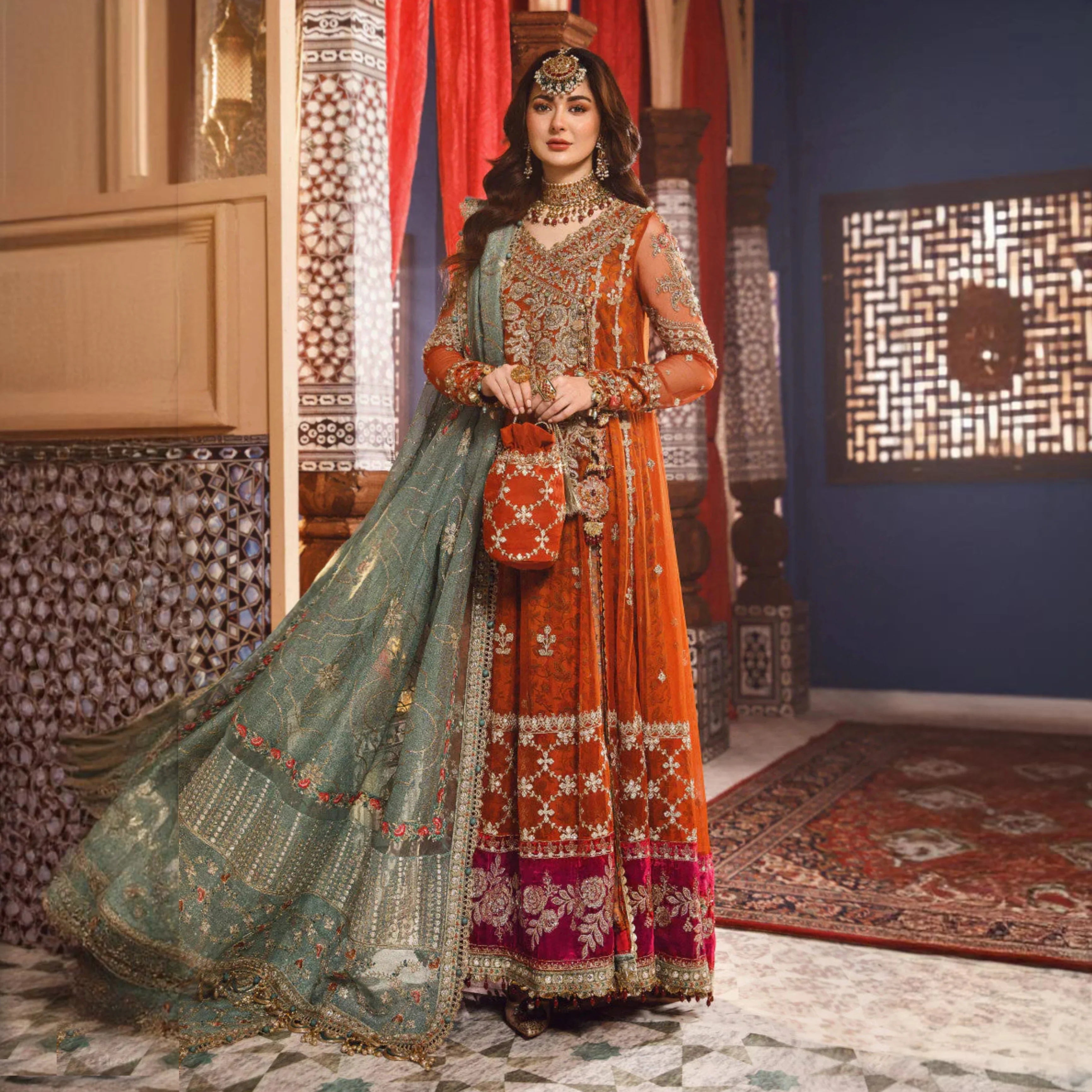 A breathtaking ensemble featuring a net bodice adorned with meticulously hand-embroidered detailing, radiating timeless elegance.