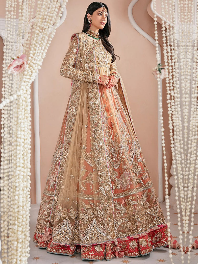 A breathtaking ensemble featuring a net bodice adorned with meticulously hand-embroidered detailing, radiating timeless elegance.