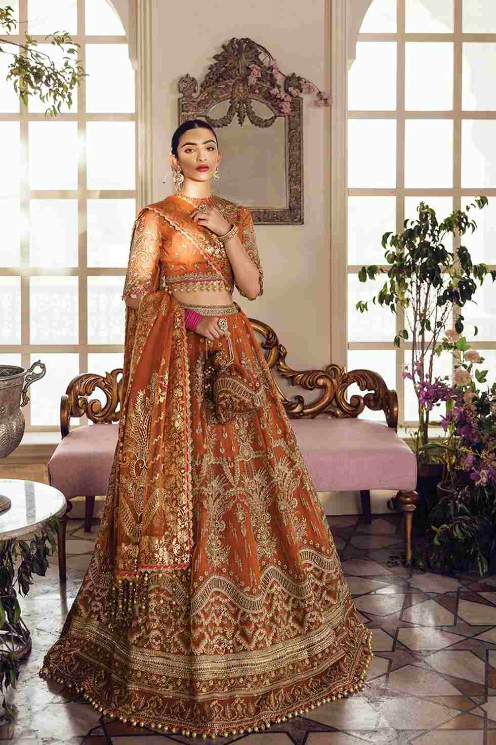 A breathtaking ensemble featuring a net bodice adorned with meticulously hand-embroidered detailing, radiating timeless elegance.